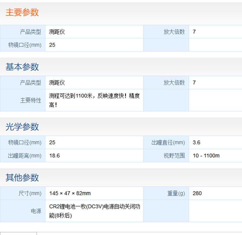 望遠鏡放大率7X,有效孔徑25mm,視場5.0°。尼康NIKON銳豪1200S測距望遠鏡量測精度±0.5m,量測范圍10-1100米/11-1200碼。測程可達到1100米,反映速度快!精度高!